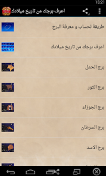 Uygulama üç bölüme ayrılmıştır, ilki, on iki burç işaretinin ve bunların karşılık gelen özelliklerinin bir listesini içerir.